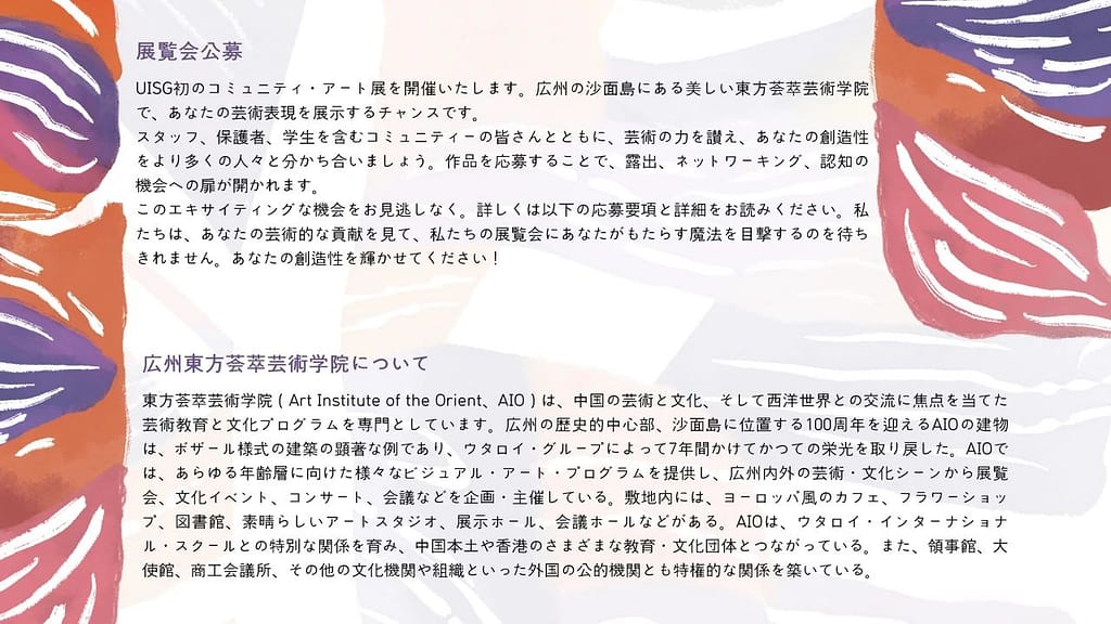 この度、第1回UISGコミュニティ・アート展を開催する運びとなりました。広州の沙面島にある美しい東洋美術学院で、あなたの芸術表現を展示するチャンスです。