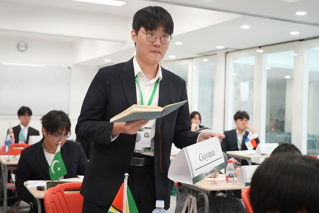 The conference opened on the 29th with inspiring speeches from MUN Director Dr. Roy and Head of Secondary Mr. Grist. They encouraged students to practice diplomacy and seek mutual benefit in their interactions. Mr. Grist compared MUN debate to a dance rather than a battle. He explained that, unlike a military conflict where there is a clear victor, debate at UISG should be like a coordinated dance – partners working together with grace and respect, guided by shared values of inclusivity and global-mindedness.