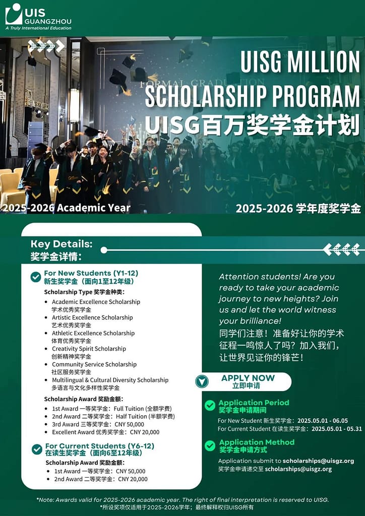 Uisg鼓励优秀的学生不断追求学术进步和个人成长此次奖学金计划面向1-12年级新生及6-12年级在读学生开放!快快来申请报名吧!