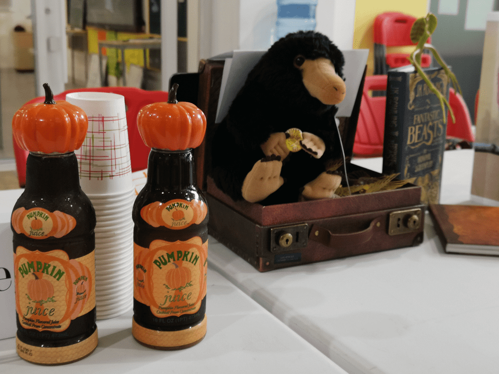 It was an intensely dramatic week for several dedicated (and fabulous) Year 9 students and teachers who joined in and read the film script. With lots of visuals and properties many of magical creatures were there in person (Teddy the Niffler, Pickett the bow truckle) and many more on paper (due to the health and safety issue for the no -maj’es). The week ended with a full house of Year 8s and 9s as the pumpkin juice was poured for a final farewell to the scripted event.