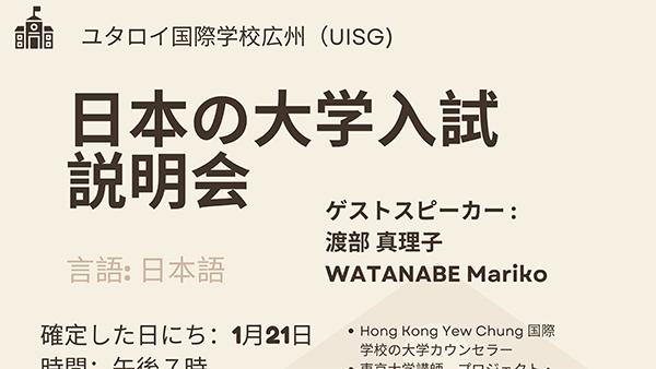 이번 행사에는 홍콩 유청 국제학교의 외부 카운슬러인 와타나베 마리코를 모시게 되어 기쁘게 생각합니다. 와타나베 선생님은 도쿄대학교에서의 경력을 포함하여 대학 입학 및 대학 상담에 대한 풍부한 경험을 바탕으로 입시 과정을 안내하는 데 도움이 되는 귀중한 통찰력을 공유할 것입니다.