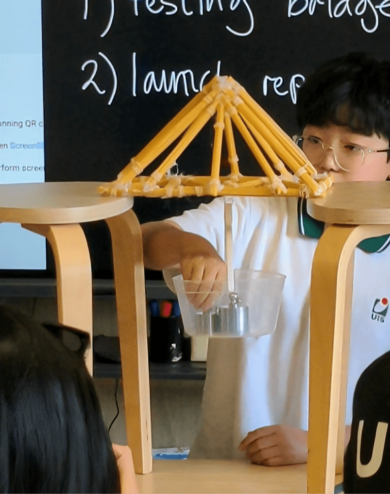 6年级学生在用意大利面建造桥梁!除了桥梁之外,他们真正在建立的是他们学习技能的方法:他们与伙伴合作;桥梁设计研究;在选择设计时提炼创造性思维技能;提高他们的时间管理技能。学生们如此投入于他们的项目,以至于他们中的许多人放弃了午餐时间来修桥。一旦完工,这些桥梁需要进行压力测试。课堂上的紧张和兴奋是显而易见的,因为学生们往篮子里放重物,希望他们的桥能有足够的强度和稳定性来承受重量(图为一座桥正在接受测试)。
