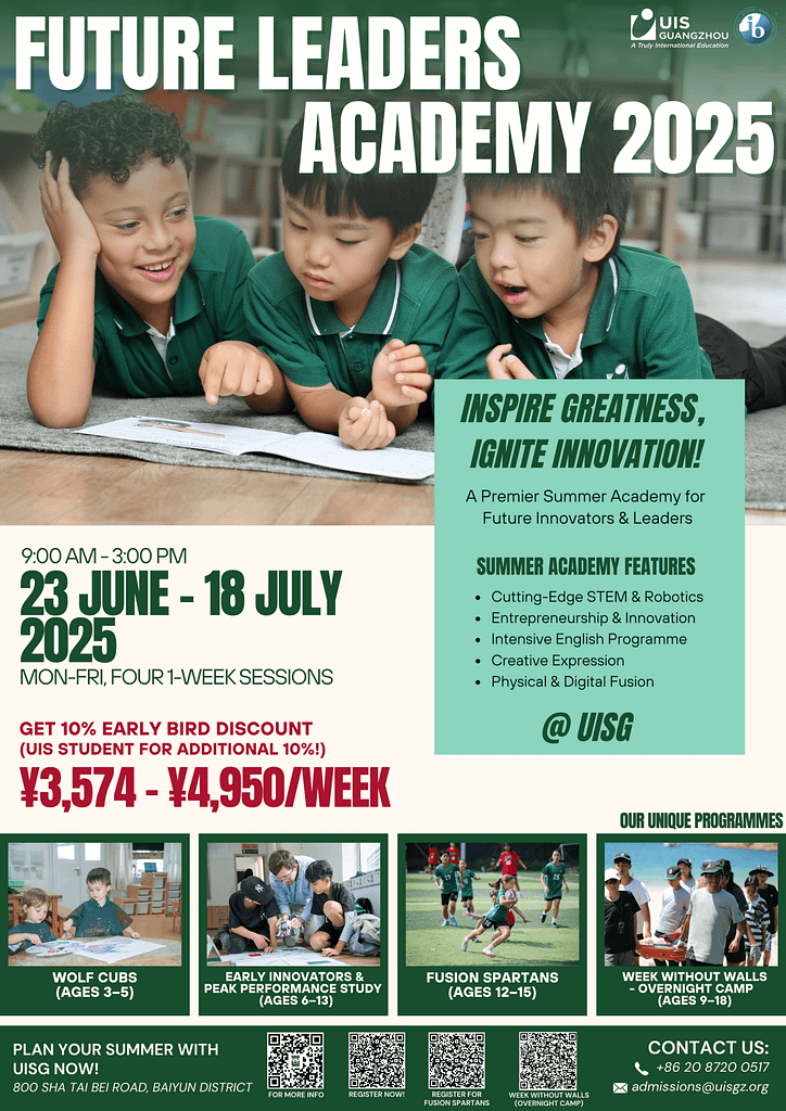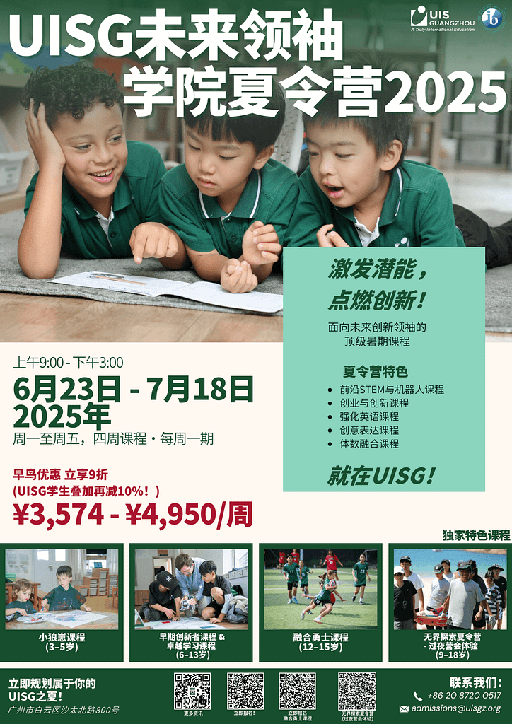 봄이 왔고 여름이 코앞으로 다가왔습니다! 부모님들은 자녀를 위한 흥미롭고 풍성한 여름 체험을 찾기 위해 고심하고 계신가요? 자녀가 지식의 세계로 뛰어들거나 독특한 모험을 통해 숨겨진 재능을 발휘하길 원하시나요? 더 이상 고민하지 마세요. 퓨처 리더스 아카데미 여름 캠프 에서 광저우 유탈로이 국제학교 (UISG) 가 아이들의 호기심을 자극합니다! 마법의 학습 놀이터로 설계된 이곳은 특별한 성장과 발견의 여정을 선사합니다. 지금 바로 시작하세요!