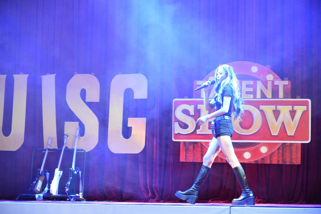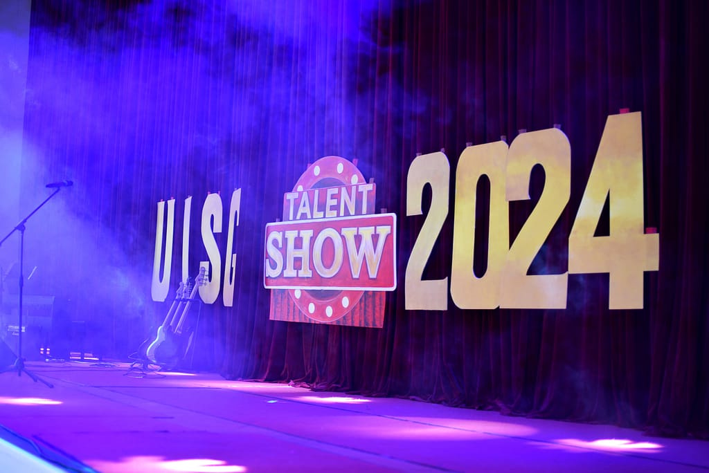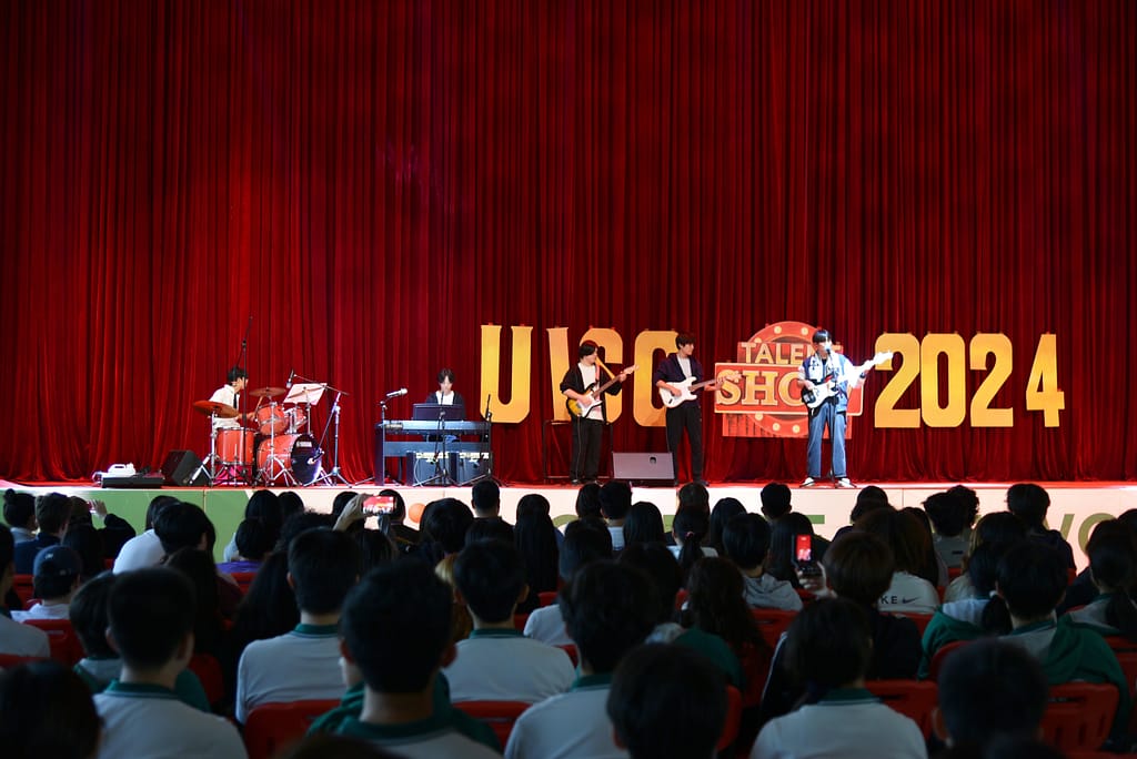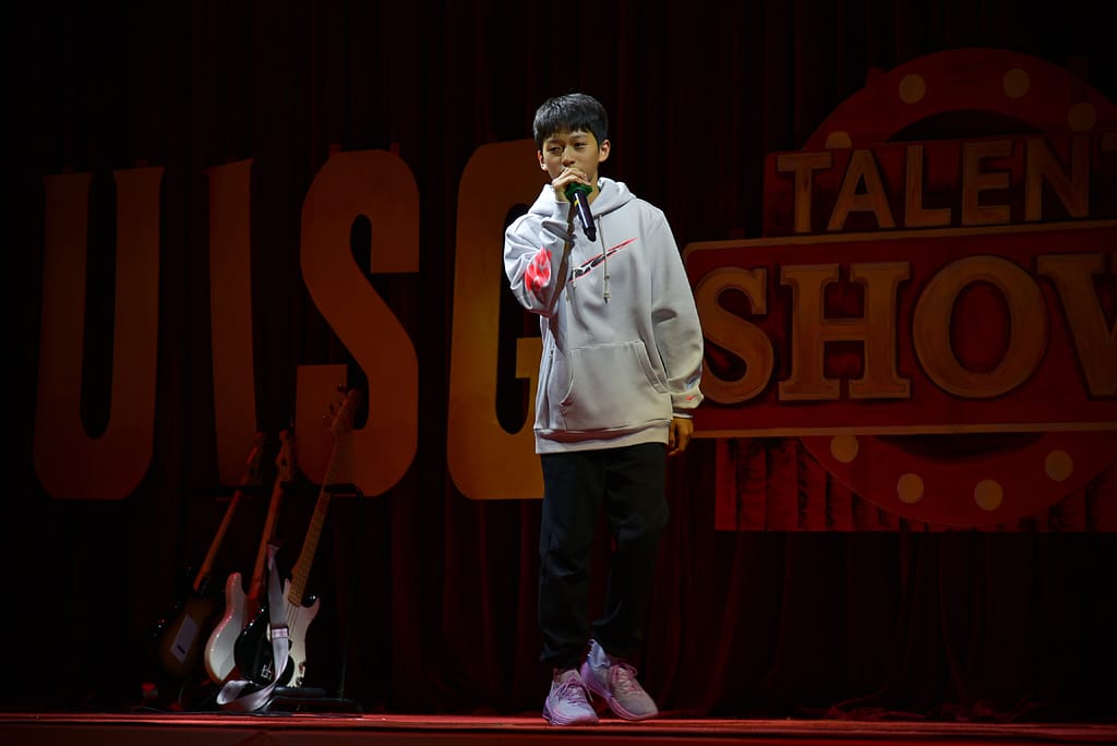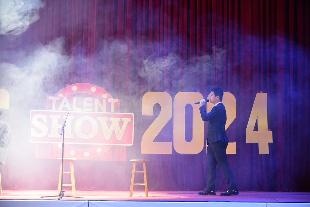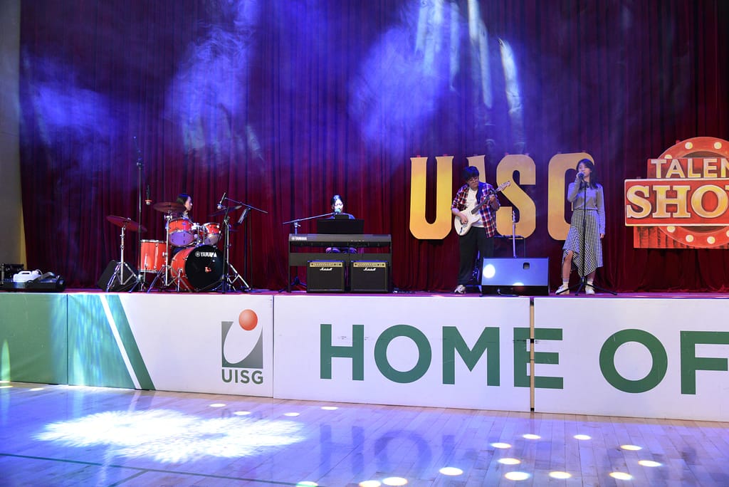 목요일 오후, 중등부 탤런트 쇼가 MFH 무대를 장식하면서 붉은 커튼 위에 'UISG TALENT SHOW 2024' 간판이 다시 올라갔습니다.