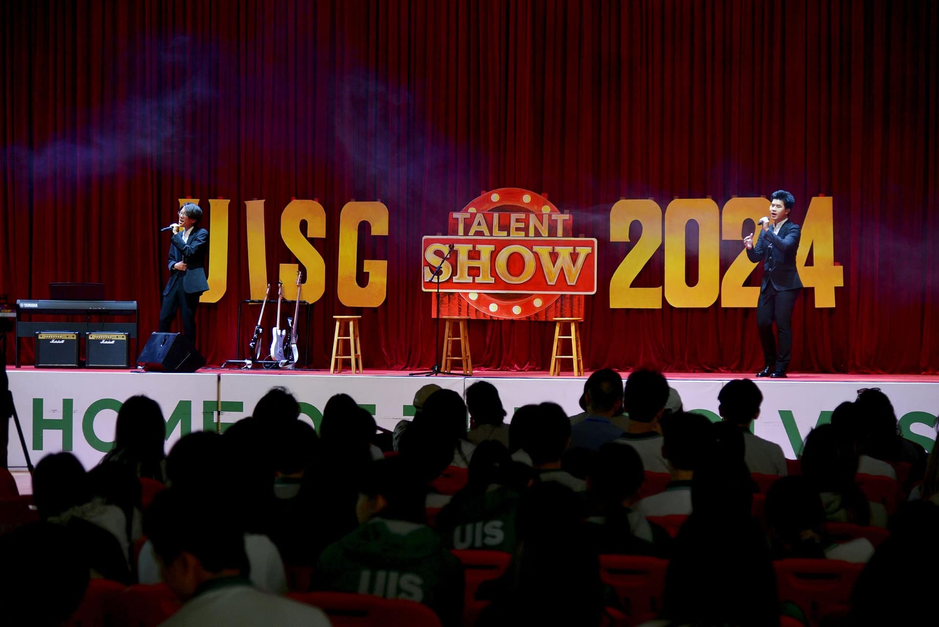 목요일 오후, 중등부 탤런트 쇼가 MFH 무대를 장식하면서 붉은 커튼 위에 'UISG TALENT SHOW 2024' 간판이 다시 올라갔습니다.