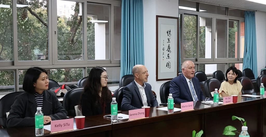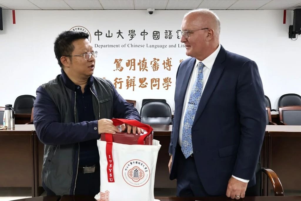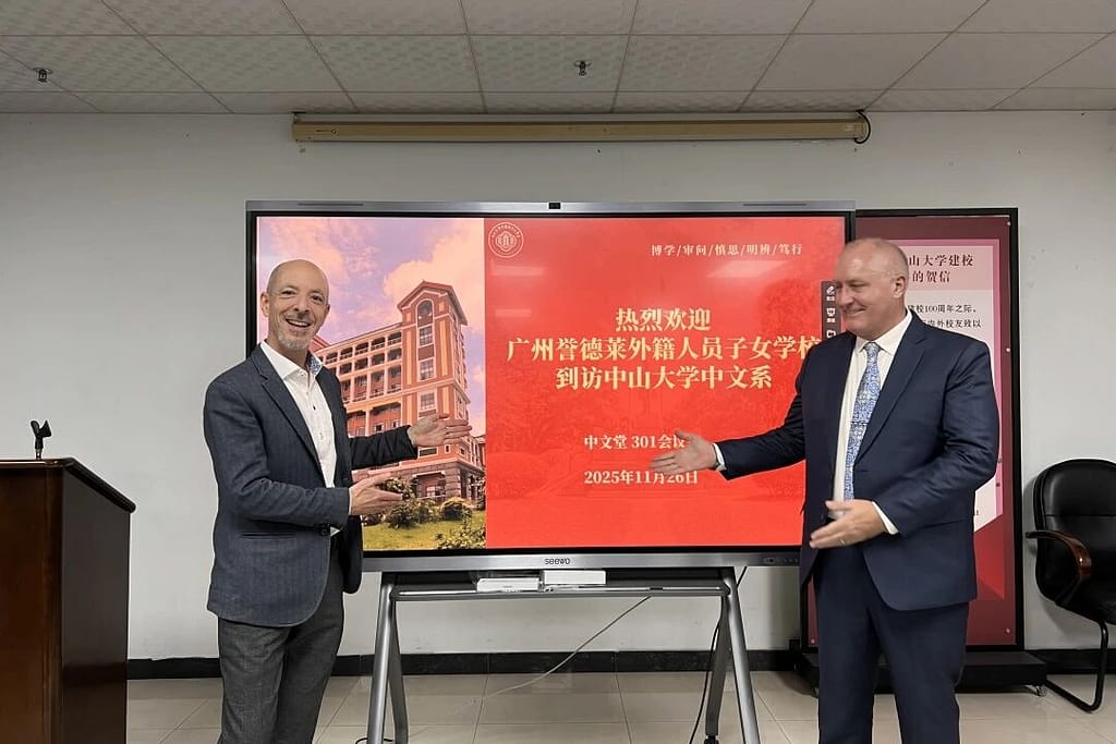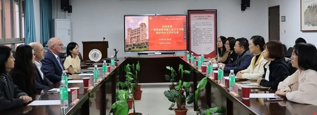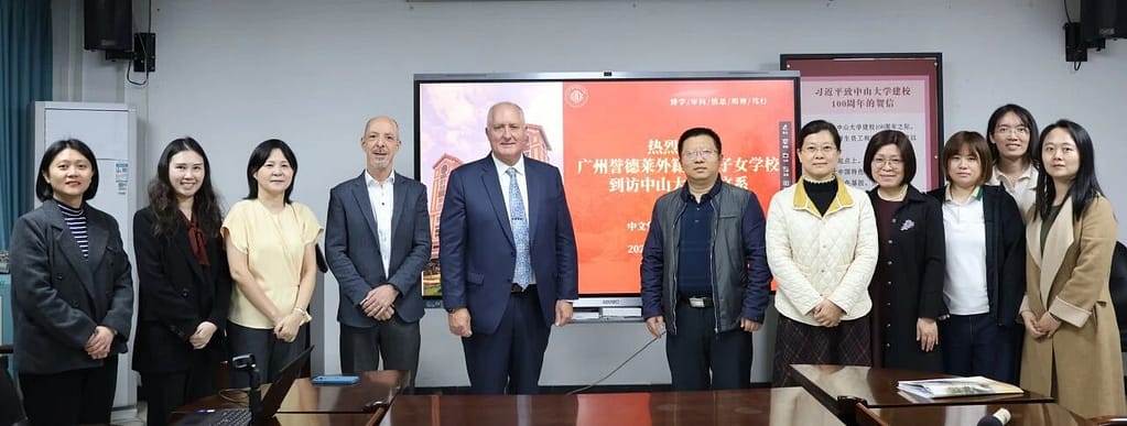 十一月末,冬阳煦暖,紫木棉缀满枝头。中山大学中文系会议堂内,一场关乎文化传承与教育合作的对话,正于宁静的冬日中透出深意。中山大学中国语言文学系党委书记王琤,系党委副书记谢金华,国际汉语中心教研室副主任邓淑兰教授等教育同仁与广州誉德莱外籍人员子女学校长Dr. Dan Mullen, 中学校长Martin Grist, 中文部主任Cindy Li, 人力资源经理Serena Zhong及专员Kelly SiTu一行,共叙旧谊,共绘新章。