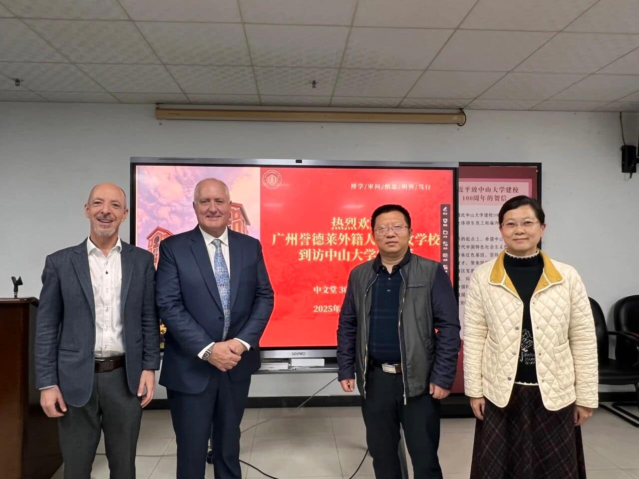 十一月末,冬阳煦暖,紫木棉缀满枝头。中山大学中文系会议堂内,一场关乎文化传承与教育合作的对话,正于宁静的冬日中透出深意。中山大学中国语言文学系党委书记王琤,系党委副书记谢金华,国际汉语中心教研室副主任邓淑兰教授等教育同仁与广州誉德莱外籍人员子女学校长Dr. Dan Mullen, 中学校长Martin Grist, 中文部主任Cindy Li, 人力资源经理Serena Zhong及专员Kelly SiTu一行,共叙旧谊,共绘新章。