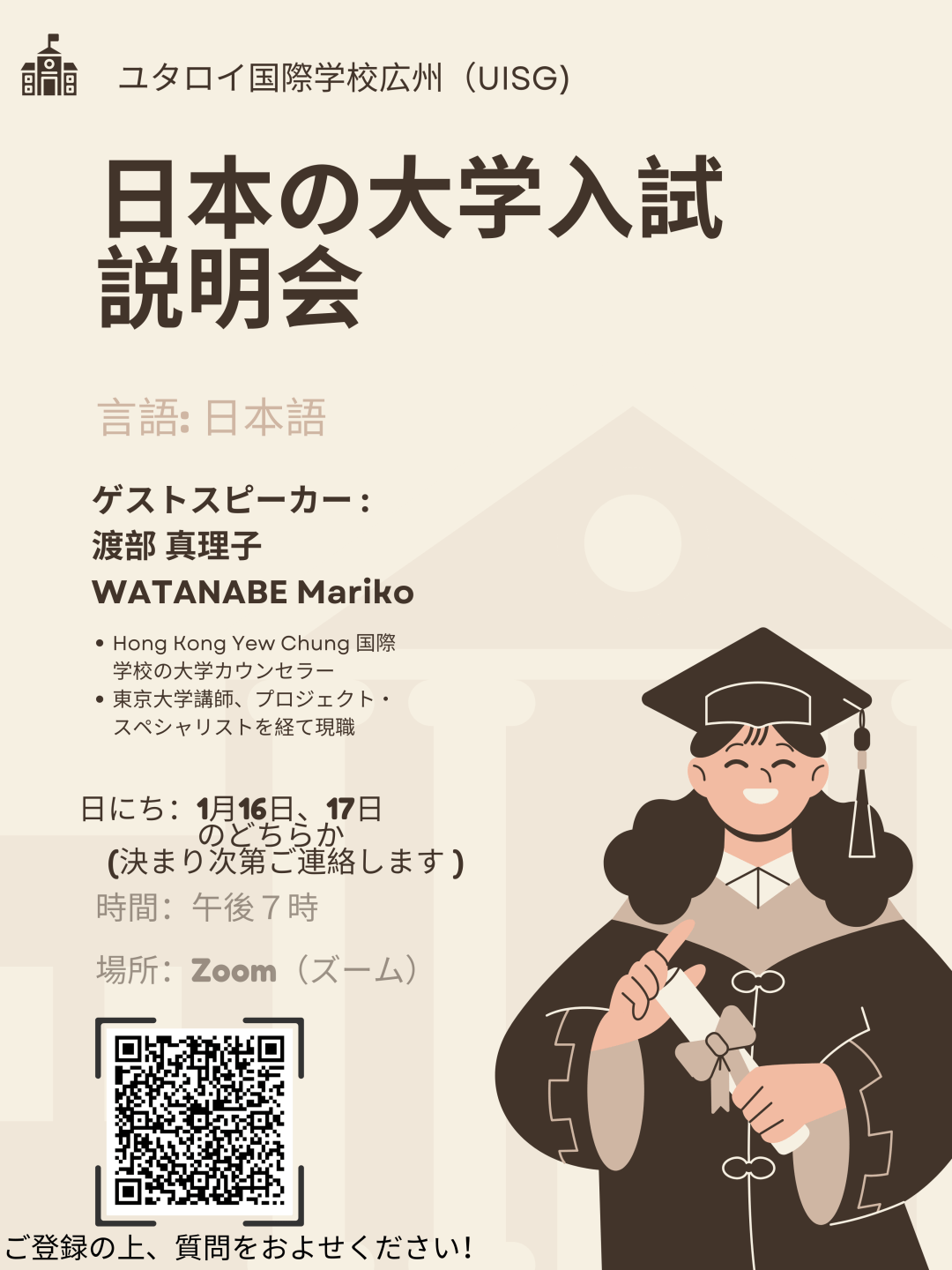 For this occasion, we are pleased to welcome Mariko Watanabe, an external counsellor from Yew Chung International School Hong Kong. With her extensive experience in both university admissions and college counselling, including her background at the University of Tokyo, Ms. Watanabe will share valuable insights to help guide you through the admissions process.