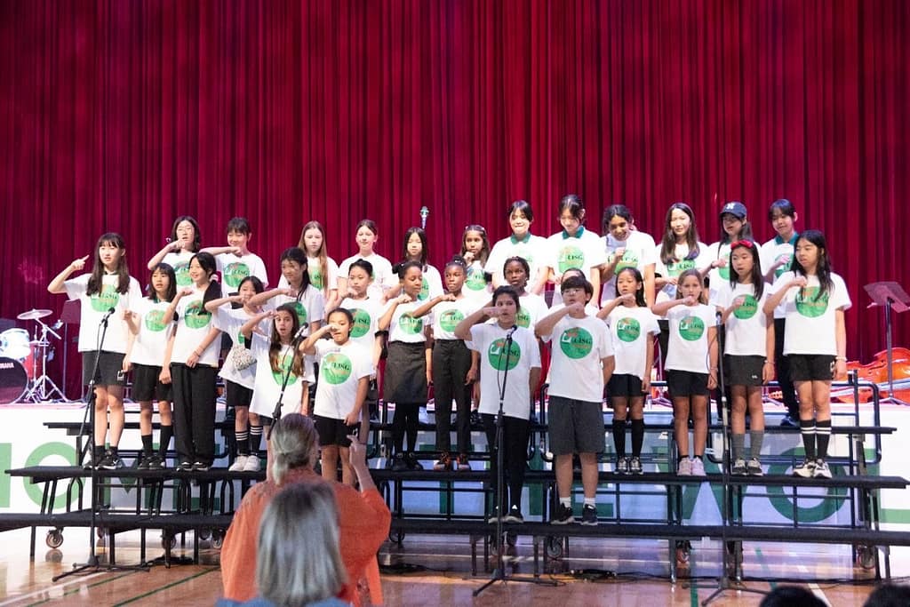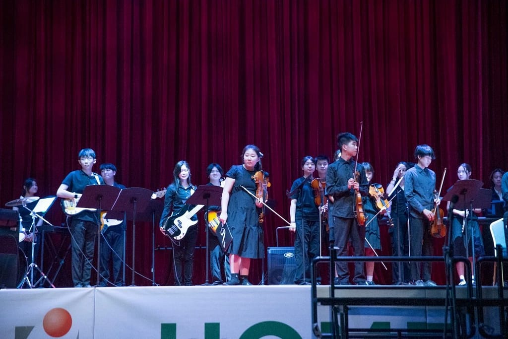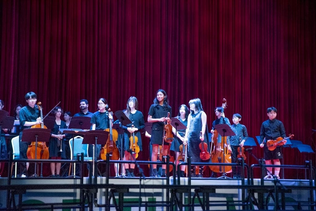 With our Secondary Student Council Arts Captain and Vice President hosting, also both members of UISG Music Groups, they guided the auidence through the programme, putting each group into context.The Summer Concert began with the three UISG Choirs.The Senior Choir, directed by Mr Josh Natal (Secondary MYP Music) and accompanied on the piano by our versatile College Counsellor, Ms YeIn Oh, presented two songs: ‘Shenandoah’ and ‘Friend Like Me’. The MYP students in the choir provided a joyful start to a very full concert.