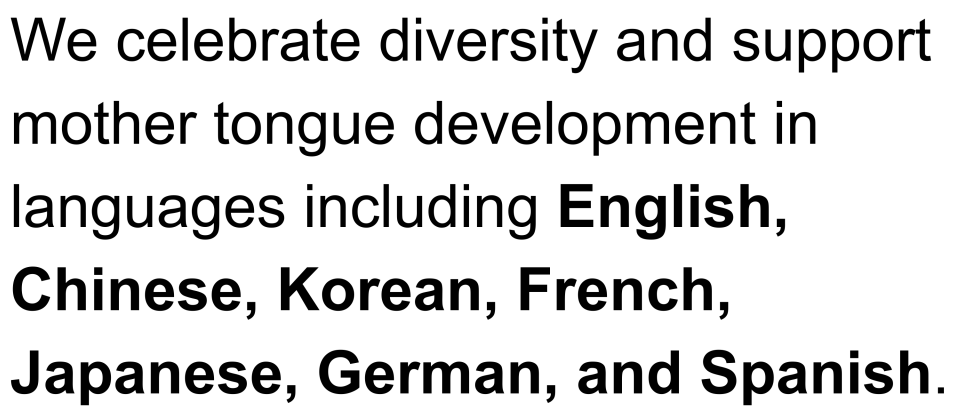 我们拥抱多样性,支持包括英语、中文、韩语、法语、日语、德语、西班牙语在内的母语发展。