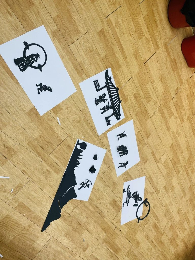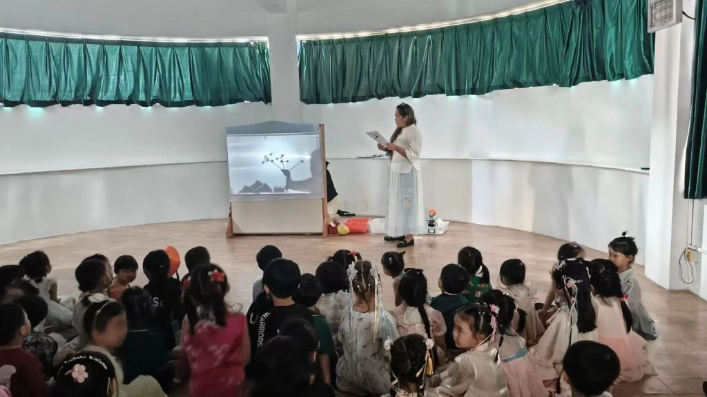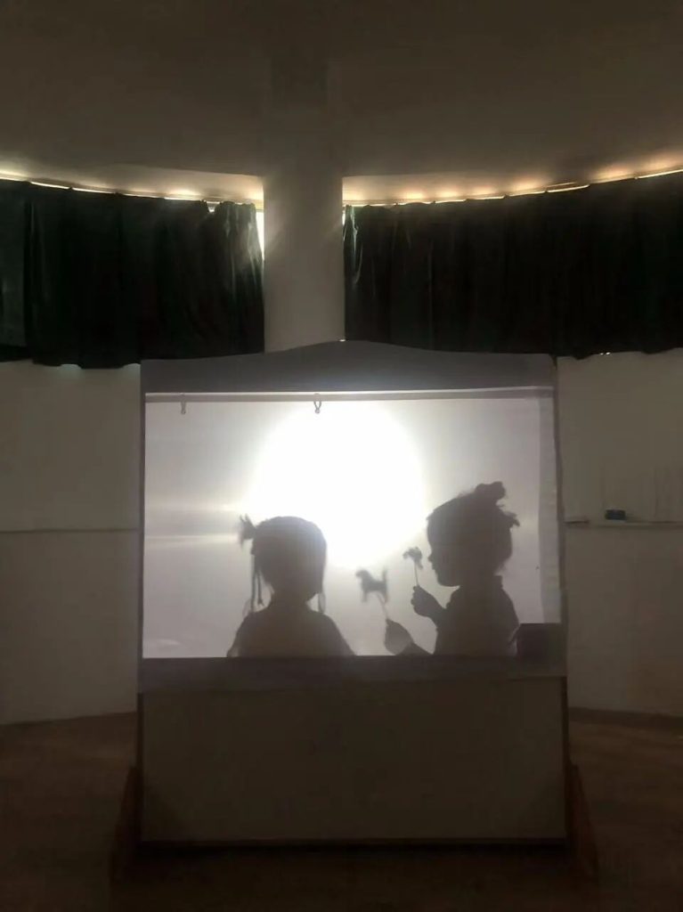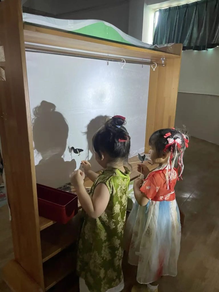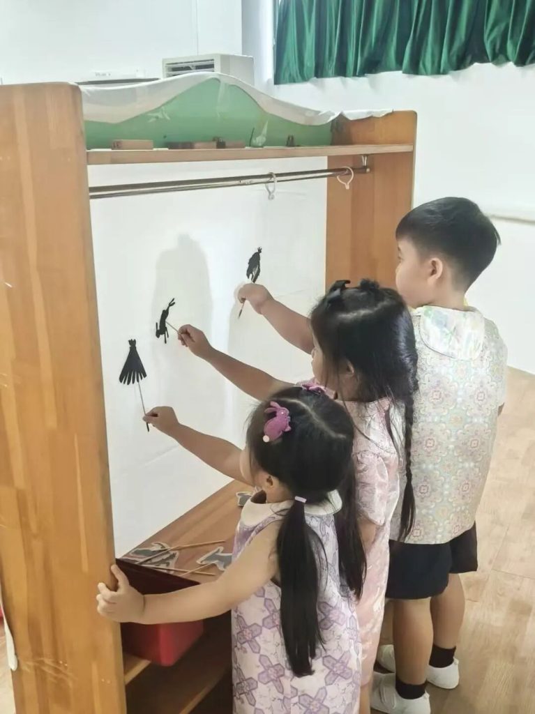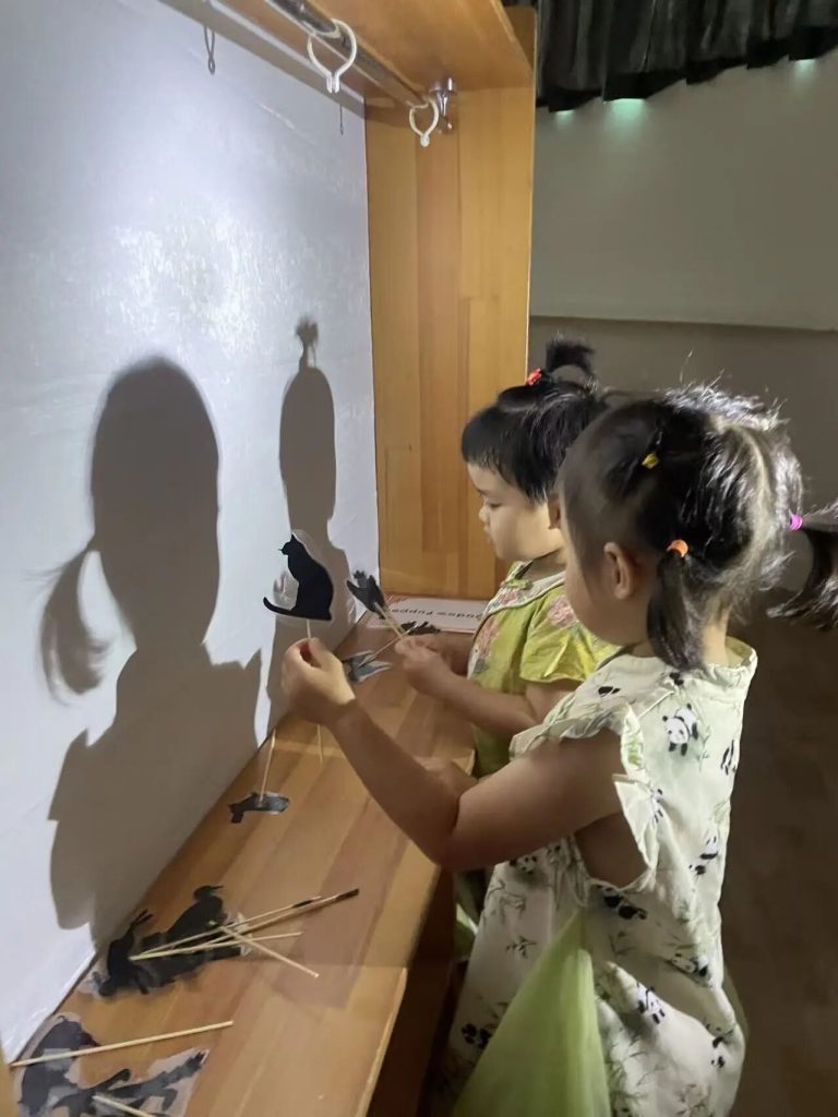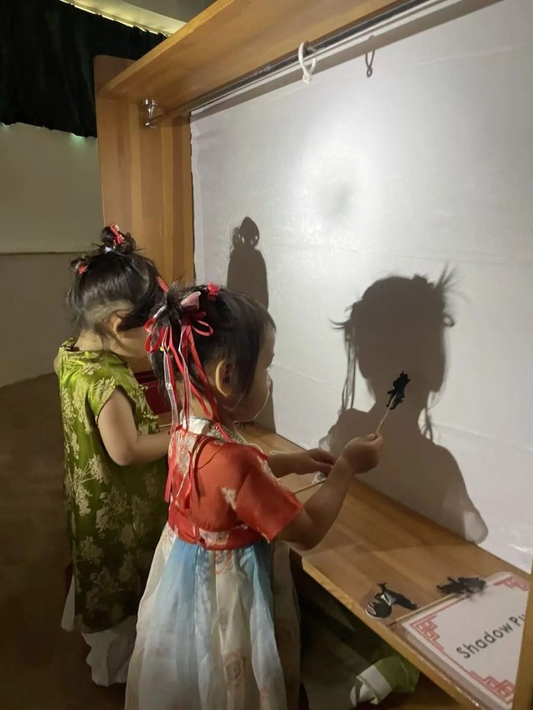 Under soft, dim lighting, the children watched as ten suns appeared on a white screen, followed by Houyi and Chang’e, scene after scene. Their eyes widened with anticipation, they watched the shadow play meticulously prepared for them by their teachers. After the shadow play performance, the children also had a chance to experience shadow puppetry. They held different shadow puppets and moved their hands up and down and left and right, feeling that they could also create a play.