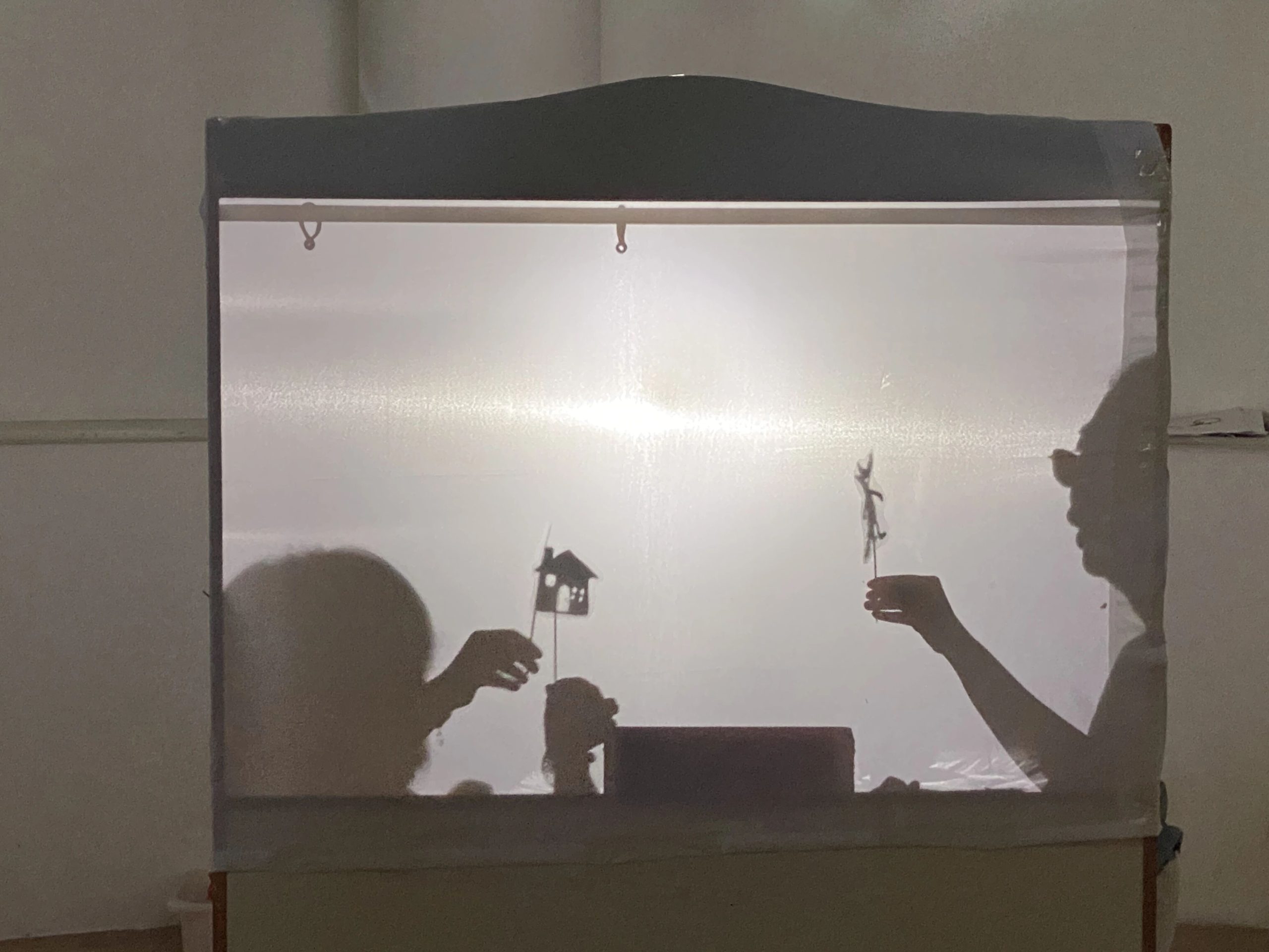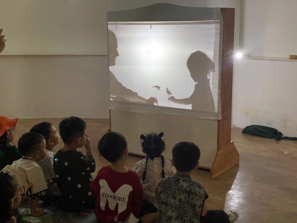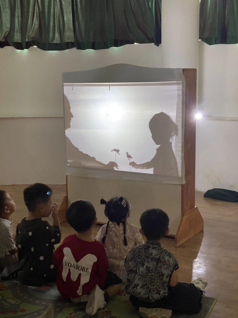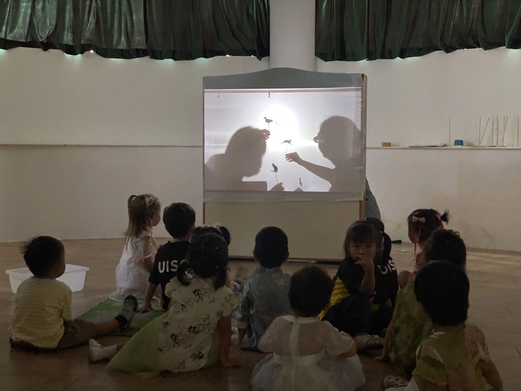 在柔和昏暗的灯光下,孩子们看着白色屏幕上出现十个太阳,随后是后羿和嫦娥,场景一幕接一幕地出现。他们睁大眼睛,目光充满期待地观看着老师们为他们精心准备的皮影戏。皮影戏表演结束后,孩子们也有机会体验皮影,他们拿着不同的皮影并上下左右移动自己的小手,体验自己也可以创作一出戏剧。