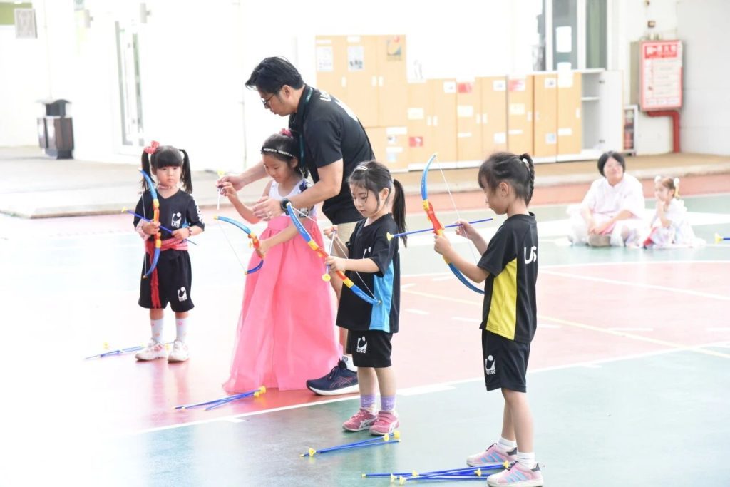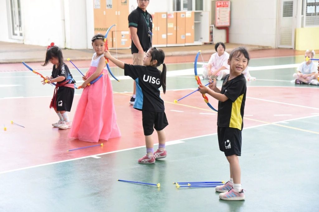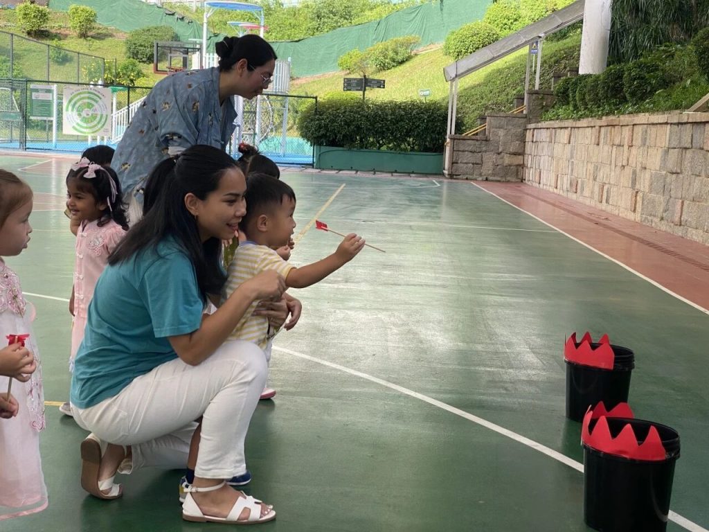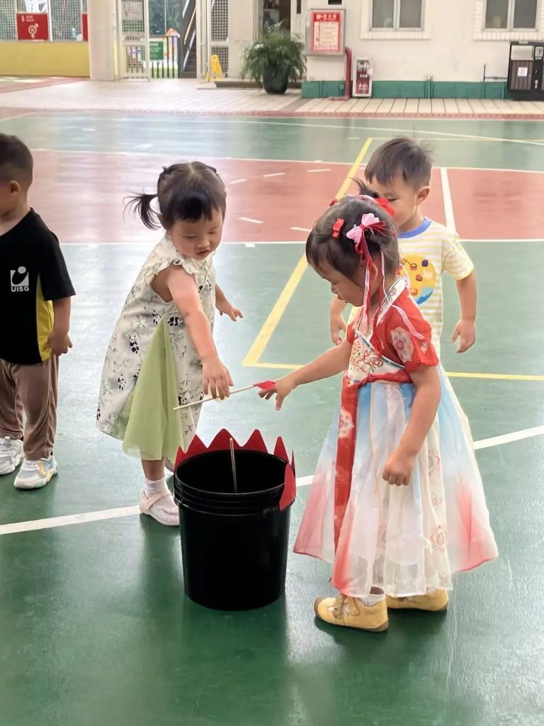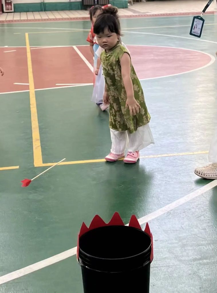 Our K and IC and Nido classes took turns playing “Toss the Arrow,” a classic game called Touhu. The children looked serious and carefully aimed at the mouth of the pot until they inserted the feather arrow into the pot.