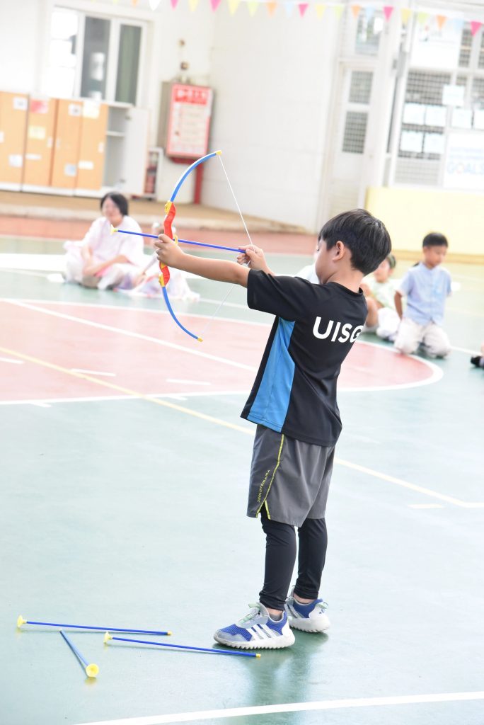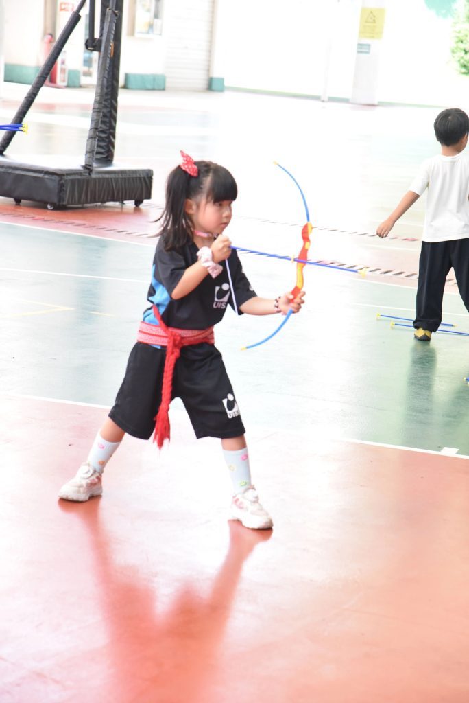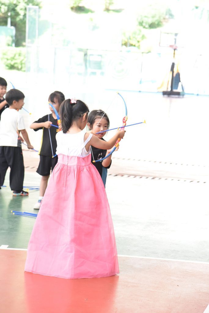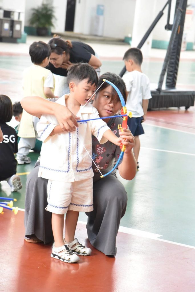 For the older children, they have the opportunity to experience archery and shoot the sun like Hou Yi. At the beginning, they didn’t even know how to insert the arrow into the bowstring, but after the teacher’s guidance, many of them were able to shoot directly into the sun. Whoosh—bang! When their arrows hit the paper sun, cheers erupted. “I did it!” the children’s faces lit up with pride.