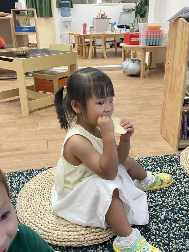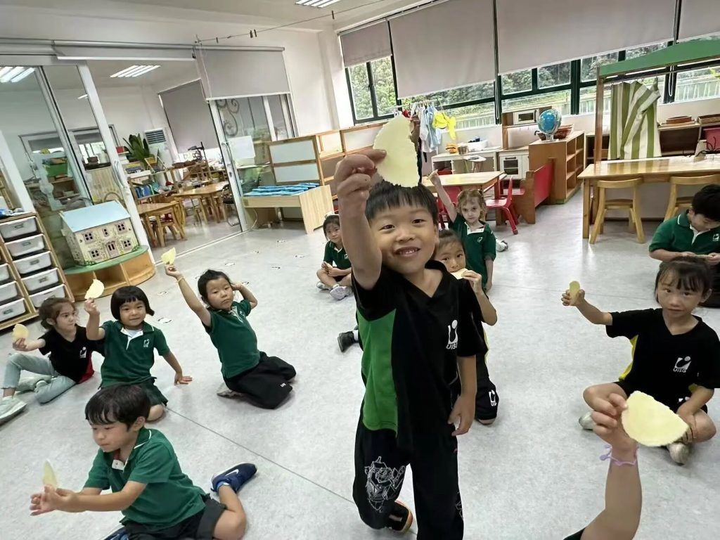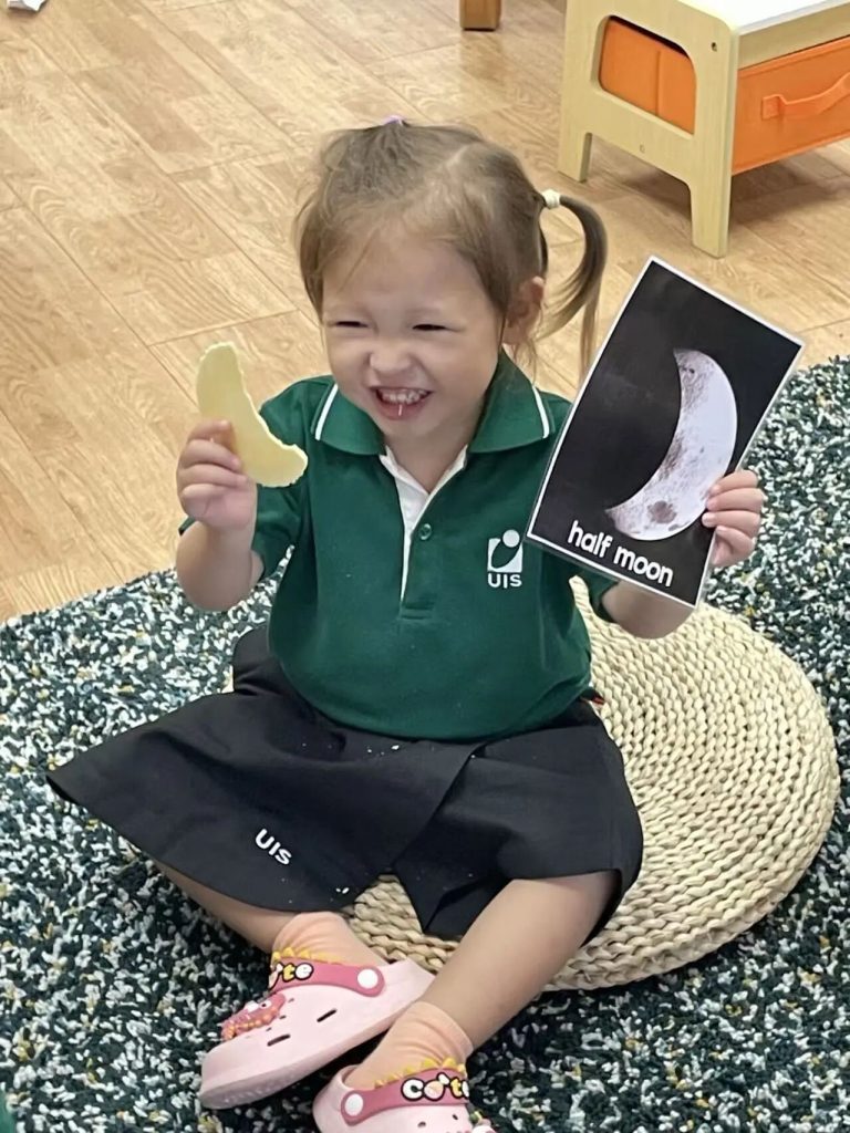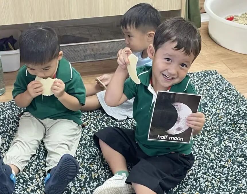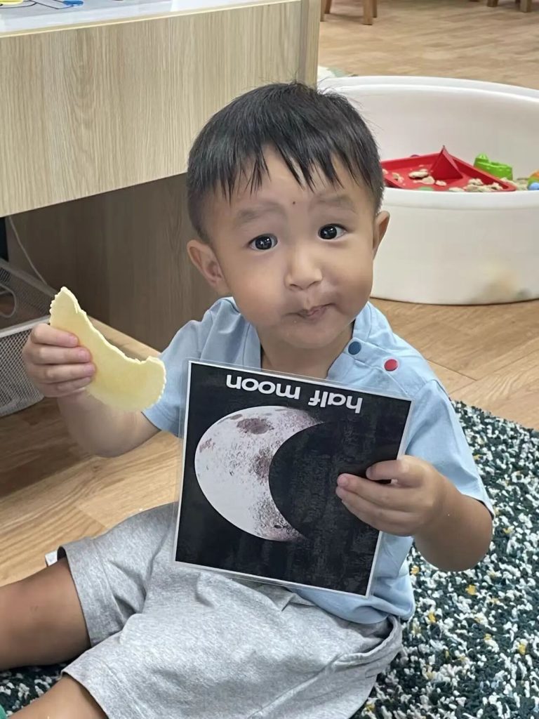 The teachers also told the children a very interesting story about the moon – “The Mouse Who Ate the Moon”. Everyone imitated the little mouse and gnawed cookies into different shapes, just like the different phases of the moon. Isn’t it fun?