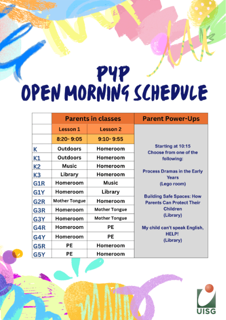 For parents, we have several helpful events. On the 13th, you are invited to our PYP Open Morning to see our primary classes in action. Later that morning, we offer Parent Power-Up sessions on important topics like online safety and English language learning support.