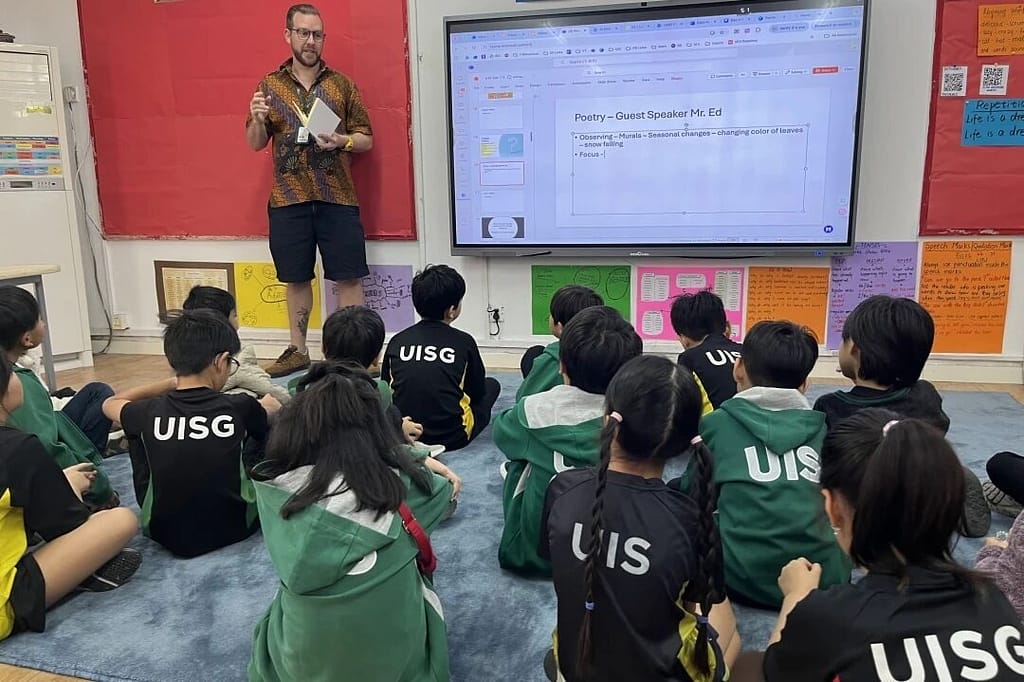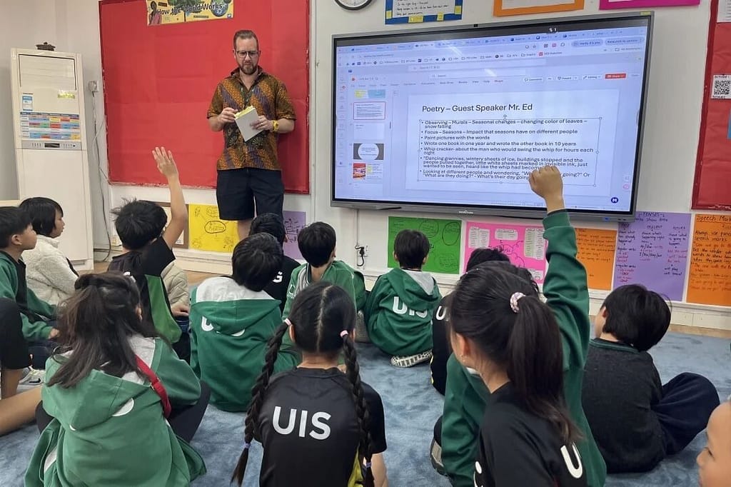 本周,诗人兼教师斯蒂尔(Steele)先生为三年级学生做了一次客座诗人访问。Steele 先生平时在高中任教,已出版了两本诗集,他与三年级学生分享了他的一些写作经验和影响。他向学生们讲述了如何写出引人入胜、与环境和感官相关的诗歌,并现场表演了几首他的诗歌,向学生们展示了他对文字游戏的热爱,尤其注重节奏、韵律和格律。全班同学都很投入,提出了很多关于写作、语言和出版方面的问题。.