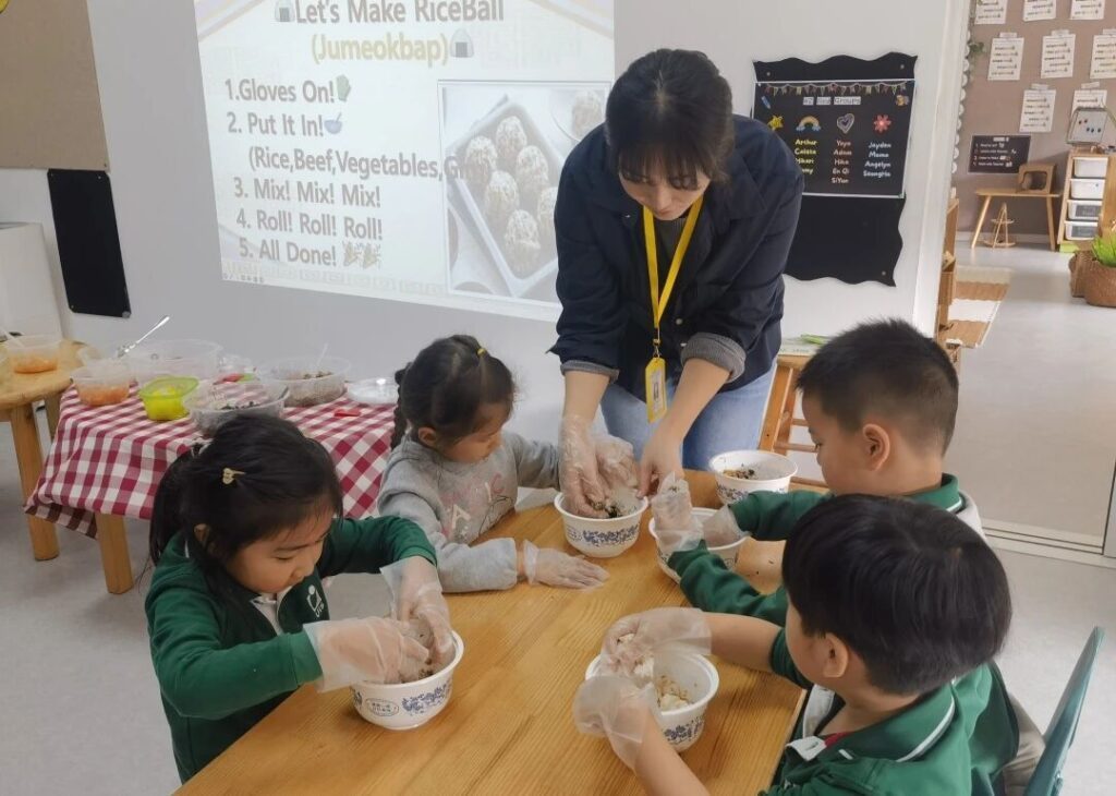 在过去的一月份,两位韩籍妈妈教大家制作了美味又简单的韩式饭团,孩子们在动手过程中也自然感受到异国文化的魅力。