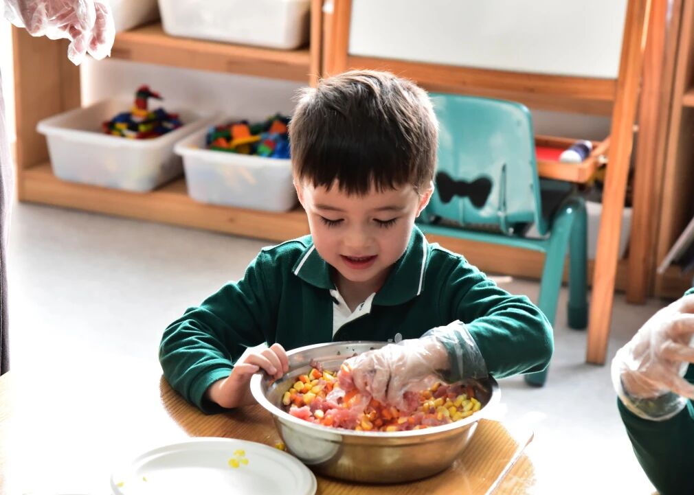 K2班的孩子们正围绕“我们是谁”这一探究单元,展开对五感的探索。家长积极参与孩子在园的学习活动,不仅能带来正向体验,也留下深远的影响。在我们策划的“与妈妈共餐”系列活动中,K2的妈妈们分批走进课堂,带领孩子们动手烹饪。