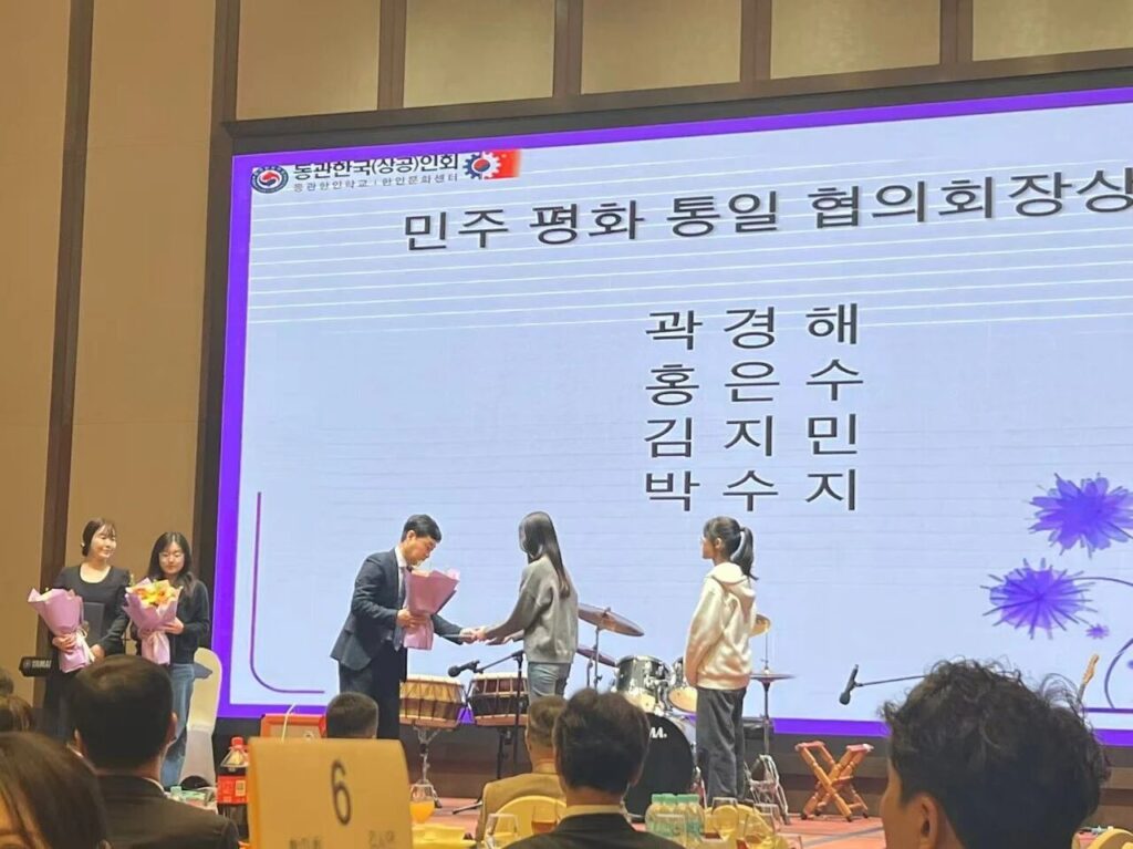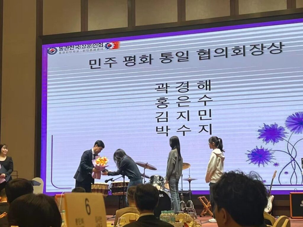 한국 총영사께서 참석 해 주신 이 시상식은 동관한국상공회의소에서 주최되었습니다. 홍은수, 김지민 학생 은 Daniel Mullen 교장 선생님의 에스코트 하에 행사장에 입장했으며, 한국어 교사인 이대우 선생님도 이 중요한 순간을 함께 축하하기 위해 참석 해 주셨습니다.